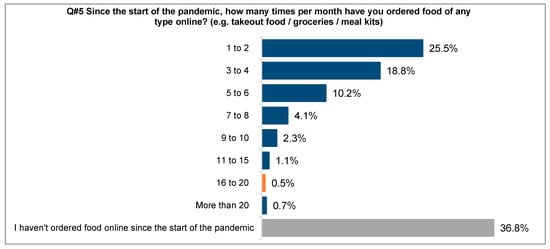 The fifth survey question asked, ‘Since the start of the pandemic, how many times per month have you ordered food of any type online? (e.g., takeout food/groceries/meal kits)’ (see Figure 5). The most popular choice was ‘I haven’t ordered food online since the start of the pandemic’ at 36.8%, with the following in order of popular responses: ‘1 to 2’ at 25.5%, ‘3 to 4’ at 18.8%, ‘5 to 6’ at 10.2%, ‘7 to 8’ at 4.1%, ‘9 to 10’ at 2.3%, ‘11 to 15’ at 1.1%, ’16 to 20’ at 0.5%, and ‘More than 20’ at 0.7%. From an age group perspective, the most popular response with all age categories was ‘I haven’t ordered food online since the start of the pandemic’. There was some variation in the age-related degree of response, with 50% of the ‘Greatest Generation’, 56.7% of ‘Boomers’, 39.7% of ‘Generation X’, 28% of ‘Generation Y’, and 32.5% of ‘Generation Z’ answering with this response.