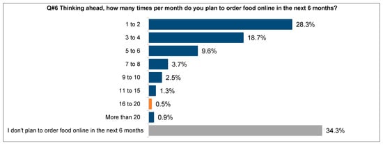 The sixth question asked, ‘Thinking ahead, how many times per month do you plan to order food online in the next 6 months?’ (see Figure 6). The most popular choice was ‘I don’t plan to order food online in the next 6 months’ at 34.3%, with the following in order of popular responses: ‘1 to 2’ at 28.3%, ‘3 to 4’ at 18.7%, ‘5 to 6’ at 9.6%, ‘7 to 8’ at 3.7%, ‘9 to 10’ at 2.5%, ’11 to 15’ at 1.3%, and ’16 to 20’ at 0.5%. From an age group perspective, the most popular response for all age categories was ‘I don’t plan to order food online in the next 6 months’ with the ‘Greatest Generation’ at 47.2%, 52.8% for ‘Boomers’, 37.5% for ‘Generation X’, and 28.9% for ‘Generation Z’. The one exceptional response was from ‘Generation Y’, where the most popular response in this age group was ‘1 to 2’ times per month where food is expected to be ordered online.