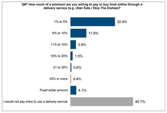 The seventh question asked ‘How much of a premium are you willing to pay to buy food online through a delivery service (e.g., Uber Eats/Skip The Dishes)?’ (see Figure 7). The most popular choice was ‘I would not pay extra to use a delivery service’ at 45.7%, with the following in order of popular responses: ‘1% to 5%’ at 32.4%, ‘6% to 10%’ at 11.5%, ‘11% to 15%’ at 3.9%, ‘16% to 20%’ at 1.5%, ‘21% to 30%’ at 0.6%, and ‘30% or more’ at 0.4%. From an age group perspective, the most popular response with all age categories was ‘I would not pay extra to use a delivery service’, with 58.3% of the ‘Greatest Generation’, 64% of ‘Boomers’, 48.7% of ‘Generation X’, 38% of ‘Generation Y’, and 34.4% of ‘Generation Z’ providing this answer.