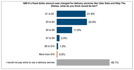 The eighth question asked ‘If a fixed dollar amount was charged for delivery services like Uber Eats and Skip The Dishes, what do you think would be fair?’ (see Figure 8). The most popular choice was ‘I would not pay extra to use a delivery service’ at 40.1%, with the following in order of popular responses: ‘$1 to $2’ at 21.9%, ‘$3 to $4’ at 22.9%, ‘$5 to $6’ at 11.6%, ‘$7 to $8’ at 2.0%, ‘$9 to $10’ at 1.0%, and ‘More than $10’ at 0.5%. From an age group perspective, the most popular response with all age categories was ‘I would not pay extra to use a deliver service’, with 52.8% of the ‘Greatest Generation’, 58.1% of ‘Boomers’, 42.9% of ‘Generation X’, 32.3% of ‘Generation Y’, and 32.8% of ‘Generation Z’ providing this answer.