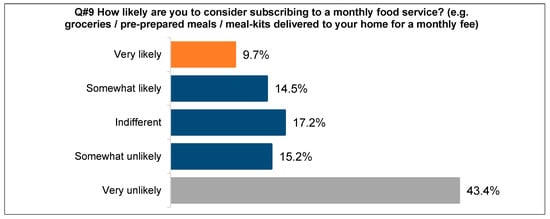 The ninth question asked, ‘How likely are you to consider subscribing to a monthly food service? (e.g., groceries/pre-prepared meals/meal-kits delivered to your home for a monthly fee) (see Figure 9)’. The most popular choice was ‘Very unlikely’ at 43.4%, with the following in order of popular responses: ‘Indifferent’ at 17.2%, ‘Somewhat unlikely’ at 15.2%, ‘Somewhat likely’ at 14.5%, and ‘Very likely’ at 9.7%. From an age group perspective, the most popular response with all age categories was ‘Very unlikely’. What is interesting is that the degree of this corresponds with age, where 69.4% of the ‘Greatest Generation’, 63.4% of ‘Boomers’, 47.5% of ‘Generation X’, 34.3% of ‘Generation Y’, and 31.7% of ‘Generation Z’ provided this answer.