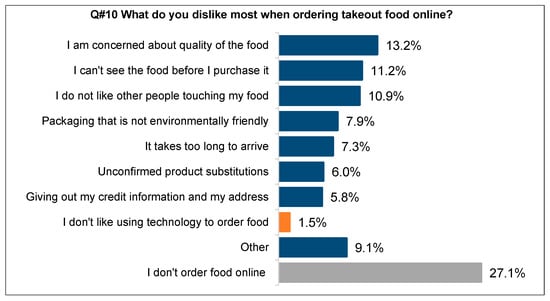 The tenth question asked, ‘What do you dislike most when ordering takeout food online?’ (see Figure 10). The most popular response was ‘I don’t order food online’ at 27.1%, with the following in order of popular responses: ‘I am concerned about the quality of the food’ at 13.2%, ‘I can’t see the food before I purchase it’ at 11.2%, ‘I do not like other people touching my food’ at 10.9%, ‘Packaging that is not environmentally friendly’ at 7.9%, ‘It takes too long to arrive’ at 7.3%, ‘Unconfirmed product substitutions’ at 6.0%, ‘Giving out my credit information and my address’ at 5.8%, and ‘I don’t like using technology to order food’ at 1.5%. From an age group perspective, the most popular response with all age categories was ‘I don’t order food online’, with 44.4% of the ‘Greatest Generation’, 45.9% of ‘Boomers’, 29% of ‘Generation X’, 19.6% of ‘Generation Y’, and 21.9% of ‘Generation Z’ providing this answer.