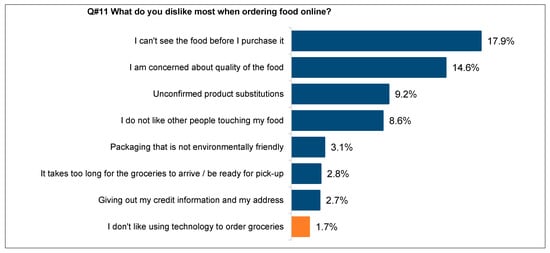 The eleventh question asked, ‘What do you dislike most when ordering food online?’ (see Figure 11). The distinction between question ten and eleven being between takeout food and groceries. The most popular response was ‘I can’t see the food before I purchase it’ at 17.9%, with the following in order of popular responses: ‘I am concerned about the quality of the food’ at 14.6%, ‘Unconfirmed product substitutions’ at 9.2%, ‘I do not like other people touching my food’ at 8.6%, ‘Packaging that is not environmentally friendly’ at 3.1%, ‘It takes too long for the groceries to arrive/be ready for pick-up’ at 2.8%, ‘Giving out my credit information and my address’ at 2.7%, and ‘I don’t like using technology to order groceries’ at 1.7%. From an age group perspective, the most popular response with all age categories was ‘I can’t see the food before I purchase it’, with 22.2% of the ‘Greatest Generation’, 14.1% of ‘Boomers’, 18.1% of ‘Generation X’, and 19.3% of ‘Generation Y’ providing this answer, with the exception of ‘Generation Z’ that answered ‘I am concerned about the quality of the food’ as the most popular answer with 16.7%.