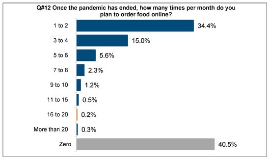 The twelfth and final question asked, ‘Once the pandemic has ended, how many times per month do you plan to order food online?’ (see Figure 12). The most popular response was ‘Zero’ at 40.5%, with the following in order of popular responses: ‘1 to 2’ at 34.4%, ‘3 to 4’ at 15%, ‘5 to 6’ at 5.6%, ‘7 to 8’ at 2.3%, ‘9 to 10’ at 1.2%, ’11 to 15’ at 0.5%, ’16 to 20’ at 0.2%, and ‘More than 20’ at 0.3%. From an age group perspective, the most popular response was somewhat divided. The ‘Greatest Generation’, ‘Boomers’, and ‘Generation X’ all indicated ‘Zero’, at 55.6%, 63.1%, and 43.6%, respectively. While the younger age groups of ‘Generation Y’ and ‘Generation Z’ responded with ‘1 to 2’ times per month in ordering food online.