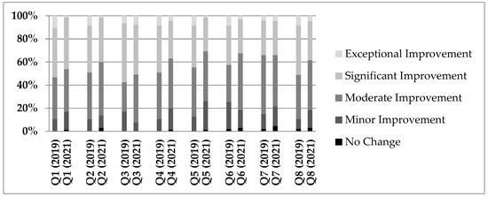 The more interesting results appear in the moderate improvement category, in which, with the exception of a decrease in learning reported of 6% for Q7 and no change in reported learning for Q5, the results otherwise indicate a surprising increase in learning across the board ranging from +1% (Q1) to +16% for Q3 and +17% for Q6. Interpreting this unexpected development, there would appear to be a consolidation of reported learning around the moderate improvement category; that is, in comparison with the 2019 pre-COVID-19 data, the 2021 COVID-19 period data indicate a reduction in both the minor improvement and significant improvement categories, with the consequence that more students are reporting a moderate improvement in their perceived learning.