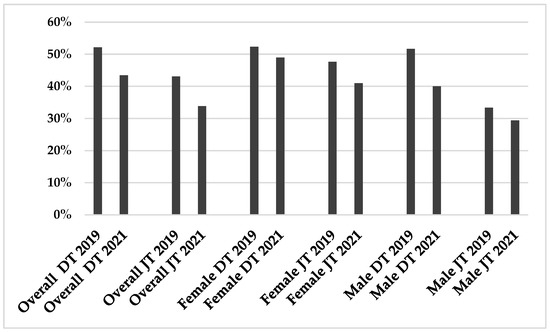 Analysis of the data with respect to distance travelled (DT) and journey travelled (JT) reveals additional patterns and trends (Table 6). Overall, the data indicates a drop in both distance travelled and journey travelled for Positive Groups 1, 2, and 3, with there being little difference in the decrease in reported learning between the three groups. In terms of Positive Groups 1 and 2, male students reported a lower decrease in journey travelled (up to 4%) learning compared with that of distance travelled (up to 12%). However, for Positive Group 3, male students reported the same 10% reduction in their perceived learning for both distance and journey travelled. In the case of female-student-orientated data, for Positive Group 3, there is no change in reported perceived learning in either the distance travelled or the journey travelled groups. Interestingly, for Positive Groups 1 and 2, a significant decrease in perceived learning occurs for journey travelled (up to 10%), but much less so for distance travelled, and with no change in learning being reported at all for distance travelled in Positive Group 1.