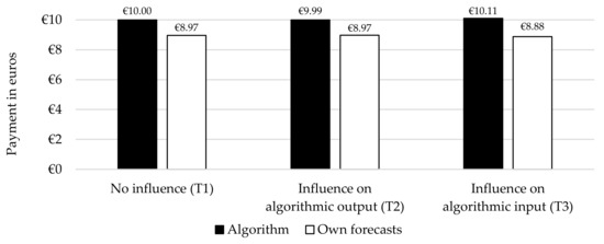 Figure 3). The Wilcoxon rank-sum test shows that the average payment—regardless of the treatment—is significantly higher if the algorithm is used as the basis of the forecasts (T1: z = 4.27,