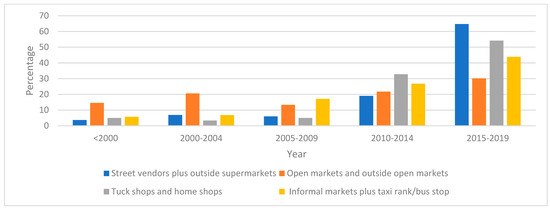 Recent surveys of household food security in Windhoek provide strong supporting evidence for the importance of the informal food sector to consumers in the city [45,46]. Table 2 shows the six main types of formal and informal food outlet in Windhoek in 2016, the percentage of households that patronized each source in the previous year, and the frequency of patronage. Almost half of all households had bought food at the city’s open markets, with 29% having patronized street vendors and 19% tuck shops. Over 80% of those buying food from street vendors and tuck shops did so at least once per week or almost every day. Open markets were patronized less frequently but still significantly more often than supermarkets. In the city’s informal settlements, food buying from informal vendors is even more frequent. For example, over 60% of those who buy from street vendors do so on a daily basis.