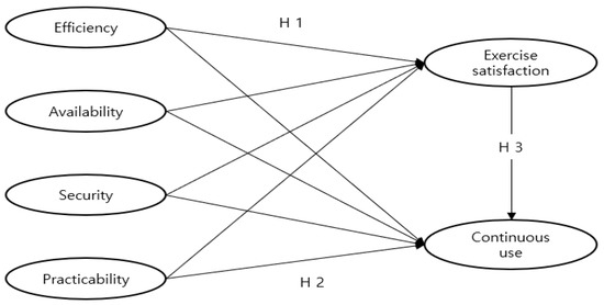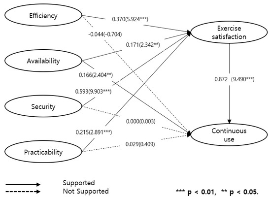 As a result of empirical analysis for Hypothesis 1, the path coefficient of efficiency was 0.370, and the critical ratio was 5.924 (p < 0.001); the availability path factor was 0.171, the critical ratio was 2.342 (p < 0.05), the security path factor was 0.593, and the critical ratio was 9.903 (p < 0.001). In execution, the sex path coefficient was 0.215, and the critical ratio was 2.891 (p < 0.01), so all sub-factors of the hypothesis were accepted. As a result of empirical analysis for Hypothesis 2, the path coefficient of availability was 0.166, and the critical ratio was 2.404 (p < 0.05). However, as the factors of efficiency, security, and feasibility were not statistically significant, the hypothesis was partially accepted. As a result of empirical analysis for Hypothesis 3, the path of exercise satisfaction in home training service quality exercise satisfaction will have an effect on reuse.