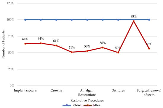 Besides the increased VAT, failed decisions to settle the foreign debt resulted in an island-wide fuel shortage in May 2022, creating miles-long vehicle queues, which directly affected the day-to-day life of the general public as well as the health professionals. As a result of this and trade union action by health workers, the overburdened public health sector was less crowded. Based on the survey-based analysis of dental care, an overall decrease was observed in the number of patients who visited the clinic per week for restorative procedures post-economic crisis (late 2022/2023) prior, comparatively, to the economic crisis (early 2022/2021). Consequently, the highest decrease was reported for dentures (49.69%), and the lowest decrease was reported for the surgical removal of teeth at 2.11% (Figure 1).