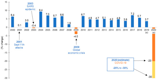 According to UNWTO [13], in 2020, when COVID-19 began spreading, international arrivals saw a decline of 65% in the first quarter of 2020 due to extended lockdowns and travel restrictions, which translated to USD 460 billion and a 50% decrease in tourism expenditure throughout the year. Figure 1 indicates the percentage change in international arrivals due to COVID-19 and other external factors from 2000 to 2010. These factors are the terrorist attack of 9/11 (2001), the SARS pandemic outbreak (2003), the impact of the global recession (2009) and the COVID-19 pandemic outbreak (2020). Clearly, the COVID-19 outbreak was what led to the most significant decrease in international arrivals for this period. Based on the point of view of Figini and Patuelli [14], in 2020, international tourist destinations (e.g., France, Spain and Italy) suffered more significant GDP losses, unlike countries less dependent on tourism (e.g., Sweden, Germany).
