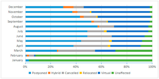 According to Figure 2, since March, when COVID-19 started to spread, a very small percentage of conferences remained unaffected and were carried out normally. In the first few months that the virus spread, most conferences were canceled (44%). This trend picked up speed around the middle of the year and gradually reduced in the second quarter when new ways of carrying them out emerged. The second largest percentage is that of virtual meetings (30%), which started at a relatively small percentage and grew until they surpassed the percentage of postponed conferences in the last couple of months of the same year.