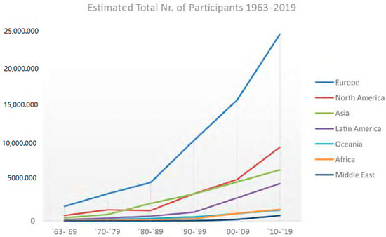 Estimated total number of participants (1963–2019). Source: ICCA [36].
