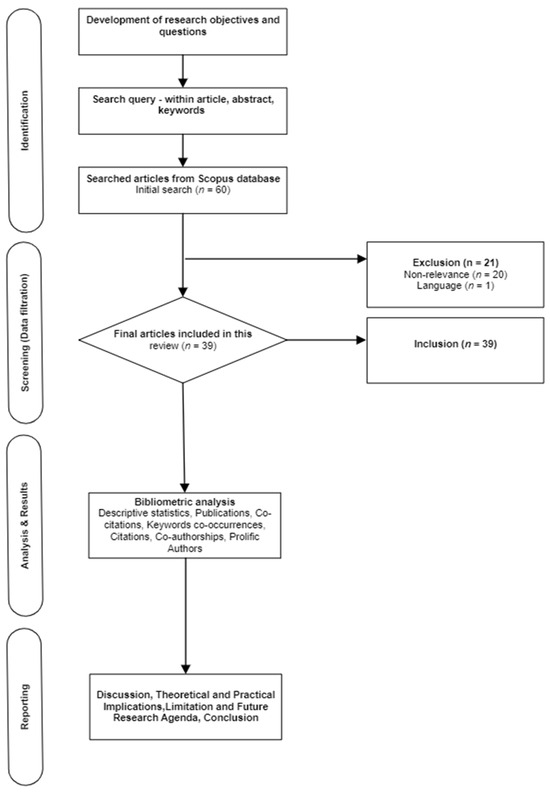 A methodological flowchart (see Figure 1) delineates the clear and logical steps followed to ensure methodological rigor. No delimitations were imposed in this regard. Consequently, a total of 60 articles published between 2007 and 2023 were compiled and exported in CSV format, compatible with the VOSviewer software, which is a versatile software tool designed for creating maps based on network data and facilitating their visualization and exploration. It further employs advanced algorithms to construct and visualize networks, utilizing techniques such as network clustering and layout optimization to reveal patterns and relationships within the data [40,41]. Subsequent screening led to the exclusion of 20 articles deemed irrelevant, along with 1 article not in English, resulting in the selection of 39 articles for bibliometric analysis. The bibliographic details of chosen articles were saved in CSV format, encompassing authors’ names, paper titles, affiliations, keywords, publication sources, references, citations, and various other data points.