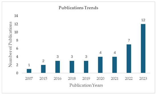 A comprehensive analysis of scholarly publications in the field offers insights into the evolution of research output on EI and PsyCap over time as presented in Figure 2 below. The analysis covered publication trends from 2007 to 2023, revealing a notable evolution in research output. The data illustrates a clear upward trajectory in the number of publications, indicating a rising interest and acknowledgment of the significance of these constructs within organizational psychology and management [43,44]. Notably, the inclusion of a single publication in 2007 marked an early recognition of EI and PsyCap as relevant research subjects, followed by a gradual but consistent increase in publications in subsequent years. A substantial surge in publications was observed in 2020 and 2021, indicating heightened scholarly activity in this domain, with the pinnacle of growth evident in 2022 and 2023. This comprehensive examination of publication trends offers valuable insights into the evolving scholarly discourse surrounding EI and PsyCap, emphasizing their increasing importance in comprehending human behavior, workplace dynamics, and organizational outcomes.