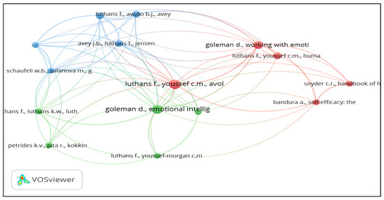 As shown in Table 3, the co-citation analysis conducted with a focus on cited authors identified 14 authors who met the threshold of a minimum of 23 citations each. Among these authors, the highest total link strength was observed for Fred Luthans, with 181 citations and a total link strength of 2888. Other notable authors with significant link strength include Avey J.B. (60 citations; 1294 total link strength), Avolio B.J. (55 citations; 1210 total link strength), and Salovey P. (55 citations; 1128 total link strength). These findings suggest that these authors are frequently cited together in the literature, indicating potential associations or collaborations in the field of study.