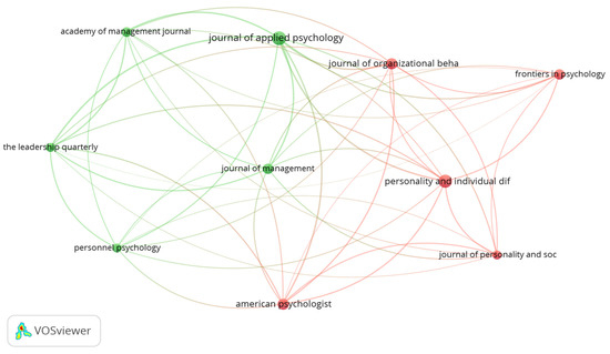 Clusters were formed based on the co-citation patterns among the identified sources, revealing distinct groupings of related research within the literature on EI and PsyCap (Figure 4). Cluster 1 (red) includes American Psychologist, Frontiers in Psychology, Journal of Organizational Behavior, Journal of Personality and Social Psychology, and Personality and Individual Differences. These sources are likely interconnected in terms of their thematic content or shared research interests within the field. Cluster 2 (green) comprises Academy of Management Journal, Journal of Applied Psychology, Journal of Managerial Psychology, Personnel Psychology, and The Leadership Quarterly. This cluster indicates another set of interconnected sources, possibly focusing on different aspects or perspectives related to EI and PsyCap. The clustering analysis provides insights into the network of relationships among the co-cited sources, highlighting potential research communities or thematic areas within the literature on EI and PsyCap and showcasing the diversity of research perspectives and approaches within the field.