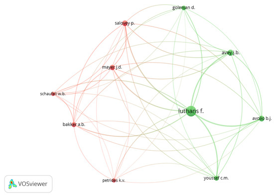 The authors were further grouped into two clusters based on their co-citation patterns. Cluster 1 (red) includes authors such as Bakker A.B., Mayer J.D., Petrides K.V., Salovey P., and Schaufeli W.B., indicating a potential thematic grouping or shared research interests among these authors. Cluster 2 (green) comprises Avey J.B., Avolio B.J., Goleman D., Luthans F., and Youssef C.M. This clustering provides insights into the network of relationships among the cited authors based on their co-citation patterns, highlighting potential research communities or thematic areas within the literature related to EI and PsyCap. The bibliometric analysis provides valuable insights into the underlying reasons and implications behind the identified clusters and themes (as shown in Figure 5).