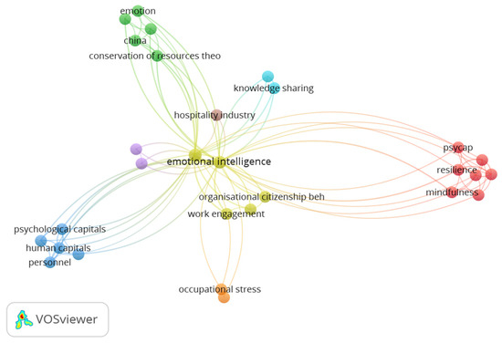 The keyword co-occurrence network analysis conducted on the literature pertaining to EI and PsyCap reveals significant emerging themes. Out of 188 keywords, 29 keywords met the minimum occurrence threshold of 2. “Emotional intelligence” and “psychological capital” emerged as prominent themes, with 30 and 26 occurrences, respectively, showcasing a substantial focus on these constructs in the literature as shown in Figure 6. Additionally, keywords such as “psychological capitals”, “resilience”, and “work engagement” each appeared three times, indicating emerging areas of interest within the field as shown in Table 4 below. The remaining keywords occurred twice.