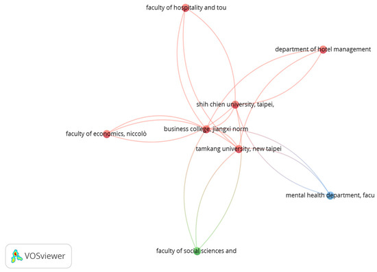 The bibliometric analysis of citations, with organizations as the unit of analysis, identified a total of 62 organizations meeting the threshold criteria out of 79 authors examined. Each of these organizations was analyzed for its total strength of citation links with other organizations. Among the selected organizations, the largest set of connected items consisted of eight organizations. Jiangxi Normal University (China) emerged as the organization with the greatest total link strength, with 28 citations and a total link strength of 7, leading to its clustering within Cluster 1. Other notable organizations within Cluster 1 include Shih Chien University (Taiwan) and Tamkang University (Taiwan), both with a total link strength of 6. Similarly, Christ (Deemed to be University) and Xavier University, both from India, each had a total link strength of 5 within Cluster 1. Suez Canal University’s Department of Hotel Management (Egypt) also clustered within Cluster 1, with a total link strength of 3. Jilin University (China), Niccoló Cusano University (Italy), Prince of Songkla University Phuket Campus (Thailand), and Taylor’s University (Malaysia) were among the organizations clustering within Cluster 1, each with a total link strength of 3 or higher. Taylor’s University from Malaysia also formed part of Cluster 2, along with Suez Canal University’s Mental Health Department from Egypt, both with a total link strength of 3 (Figure 7). This analysis highlights the interconnectivity and collaboration among various academic institutions across different countries in contributing to research on EI and PsyCap.