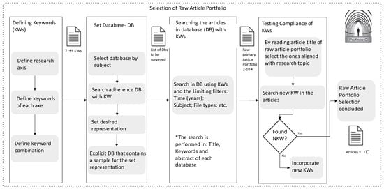 The first stage in the procedure is carried out by selecting a raw bank of articles, presented in Figure 1. This stage comprises the following steps: establishing the keywords; describing the database; performing a query; and verifying the keywords []. To extrapolate scientific contributions for analysis, several scientific databases were investigated. Eventually, Web of Science (WoS) and Scopus were chosen for this study due to their wide use in academia and the breadth of contributions they contain. The two databases chosen to search for contributions are significant for two reasons. On the one hand, Scopus contains a very significant number of contributions, even including up to 70% of the literature of Web of Science; however, the latter has a higher citation rate in the field of engineering [,].