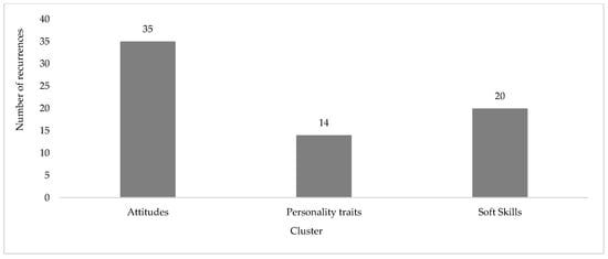 Furthermore, the recurrence distribution, i.e., the frequency with which the topics of the different works, including the words under consideration, were addressed, is not uniform. As shown in Figure 5, the attitudes within the portfolio are the ones that count a more significant number of recurrences, followed by soft skills and, last, topics related to personality traits. This discrepancy of accounts underlines the frequency with which specific issues are addressed but could also be a driver for defining areas of interest to be further explored.