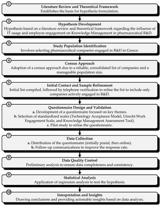 This study employs an empirical research methodology to investigate the impact of Information Technology usage and employee engagement on the implementation of Knowledge Management in pharmaceutical R&D. The chosen approach integrates rigorous hypothesis testing grounded in a comprehensive literature review and a robust theoretical framework, enabling a structured exploration of how these factors interact within this specific industry. This design was selected to facilitate a detailed examination of the empirical evidence against an established theory, thereby enriching the understanding of Knowledge Management dynamics in a highly specialized context. By detailing the study population and the census approach and carefully outlining the instruments and procedures for data collection, the methodology ensures that each component contributes effectively to the overall data integrity and analysis reliability. Statistical methods were chosen for their robustness in addressing the complexity of the relationships modeled, ensuring that the analysis could handle the effect of Information Technology and employee engagement on Knowledge Management. This empirical framework, depicted in Figure 1, is pivotal in not only addressing the study’s research question but also in providing actionable insights that are validated through rigorous data collection and analytical techniques.