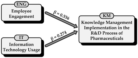 In this subsection, we test the research hypothesis, which examines the statistically significant effects of Information Technology usage and employee engagement on the implementation of Knowledge Management in the R&D process of pharmaceutical companies. A multiple linear regression analysis is conducted (KM = α + β1 IT + β2 ENG) with the following variables: