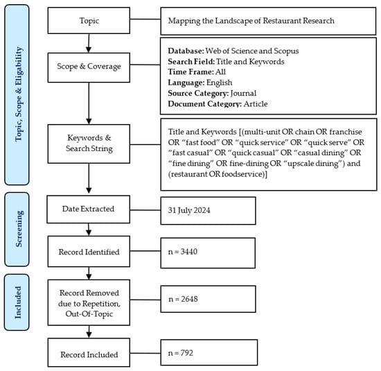 We extracted data from both Web of Science (WoS) and Scopus, to ensure comprehensive coverage of published literature (). WoS is a leading database that contains impactful and high-quality articles in hospitality (), tourism (), and management (). In contrast, Scopus is widely utilized in bibliometric studies due to its comprehensive coverage of bibliographic data over time (). As such, Scopus data were simultaneously extracted in the current research to ensure all the pertinent and empirical studies concerning the restaurant industry are included (). Drawing upon the standard bibliometric analysis protocol (), the titles and keywords of publications in both Web of Science and Scopus were searched using the following Boolean search queries: (multi-unit OR chain OR franchise OR “fast food” OR “quick service” OR “quick serve” OR “fast casual” OR “quick casual” OR “casual dining” OR “fine dining” OR fine-dining OR “upscale dining”) and (restaurant OR foodservice). This restaurant categorization (i.e., fast food, fast casual, casual dining, and fine dining) is an accepted typology from the National Restaurant Association (). Additional search term alternatives were included to increase output completeness, e.g., “quick service” or “quick serve” can be a substitute for “fast food”. As a result, this search yielded 1403 and 2891 articles in WoS and Scopus, respectively.