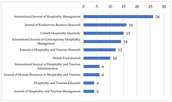 Figure 5 demonstrates journals that published the top 10 greatest number of articles related to organizational behavior in the restaurant sector. Specifically, among the 265 articles analyzed, the top three journal outlets are the International Journal of Hospitality Management (26 articles, 9.81%), the Journal of Foodservice Business Research (16 articles, 6.04%) and the Cornell Hospitality Quarterly (15 articles, 5.66%), followed by the International Journal of Contemporary Hospitality Management (14 articles, 5.28%), the Journal of Hospitality and Tourism Research (12 articles, 4.53%), and the British Food Journal (10 articles, 3.77%). The next four journals, whose publication scope was more organization and management-focused, included the International Journal of Hospitality and Tourism Administration (six articles, 2.26%), the Journal of Human Resources in Hospitality and Tourism (six articles, 2.26%), the Hospitality and Tourism Educator (four articles, 1.51%), and the Journal of Hospitality and Tourism Management (four articles, 1.51%).