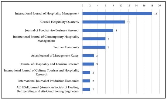Figure 6 depicts journals that published the top 10 greatest number of articles related to finance in the restaurant sector. Specifically, among the 118 articles analyzed, the International Journal of Hospitality Management ranks the highest (18 articles, 15.25%), followed by the Cornell Hospitality Quarterly (11 articles, 9.32%), the Journal of Foodservice Business Research (8 articles, 6.78%), the International Journal of Contemporary Hospitality Management (6 articles, 5.08%), Tourism Economics (6 articles, 5.08%), the Asian Journal of Management Cases (3 articles, 2.54%), the Journal of Hospitality and Tourism Research (3 articles, 2.54%), the International Journal of Culture, Tourism and Hospitality Research (2 articles, 1.69%), the International Journal of Production Economics (2 articles, 1.69%), and the ASHRAE Journal (2 articles, 1.69%).