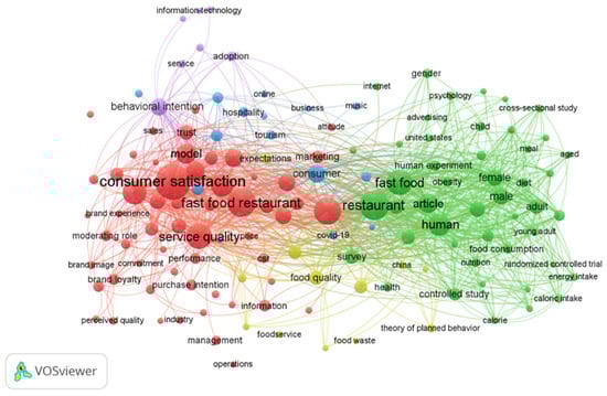 The 138 main keywords were grouped into five thematic clusters, including service quality and consumer satisfaction, fast food and healthy eating, servicescape, food waste, and technology adoption. Specifically, the red cluster, centered on the concept of consumer satisfaction, included items that are lexically and conceptually correlated. As consumer satisfaction is the difference between consumers’ perceptions and expectations (), its antecedents of service quality, consumer perception (), and consequences such as word of mouth () and willingness to pay () were examined in various restaurant contexts, i.e., fast food, casual dining, and chain restaurants (). Moreover, a series of brand-related items emerged in this cluster, including brand awareness, brand equity, brand image, brand loyalty, and brand trust (; ). These concepts were treated as antecedents of consumer attitudes about fast food or casual dining restaurants ().
