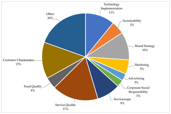 Examination of the explanatory variables identified within the consumer behavior research revealed a strong emphasis on service quality (17%) that was often used to explain response variables such as customer satisfaction, loyalty, and perceived value (Figure 8). Customer characteristics (13%) such as demographics, lifestyle preferences, and dining habits were examined to identify their influences on food products and business choices. Technology (11%) was also a prevalent theme, with studies investigating its impact on things such as ordering efficiency, consumer trust in automation, and adoption of self-service kiosks. Brand strategy (10%) and marketing (5%) explanatory variables collectively accounted for 15% of the literature. This research focused on understanding response variables such as purchase intentions and customer satisfaction. While advertising (3%) received comparatively less focus, these studies explored its role in consumer response to promotional messages and promotions. The physical dining environment (servicescape, 9%), including building design and atmosphere aroma, were examined to determine any associations with topics such as dining duration and willingness to pay premium prices. Research on sustainability related factors (corporate social responsibility, 3%; sustainability, 5%) examined how explanatory variables such as eco-friendly initiatives, ethical sourcing, and sustainability messaging influenced, for example, consumer trust and purchasing decisions. Food quality (4%) was examined to determine its associations with response variables such as purchase intention and repeat patronage. The remaining 20% of the studies examined other explanatory variables such as menu attributes and social media reviews.