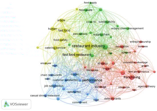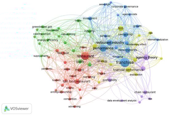 The keyword co-occurrence network contained five clusters. The red cluster includes terms that are lexically linked to the context of fast food restaurants (; ) with service companies’ performance proxies, i.e., market share (), sales (), and entrepreneurship (), as major financial foci, that were examined in this cluster.