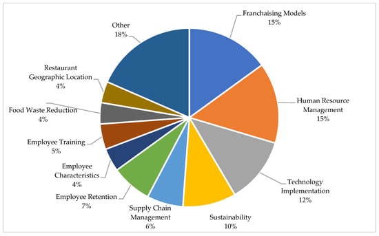 The top 10 research themes within the Organizational Behavior field are presented in Figure 10. Human resource management (15%) was one of the most studied themes. The topics in this theme included managerial decisions used to understand and improve restaurant operations by impacting employee performance and operational efficiencies. Closely related to this theme was research on employee retention (7%), employee training (5%), and employee characteristics (4%). These topics addressed the effects of workforce skill development and employee traits on operation efficiencies and turnover rates. Other major areas of study included franchising models (15%) and restaurant geographic locations (4%). These studies explored business expansion strategies, market positioning, and the impact of site selection on restaurant success. Other topics of significant interest were supply chain management (6%) and technology implementation (12%). These topics reflected the desire to understand and modify procurement and automation methods to enhance operational efficiency and reduce costs. Ecological concerns were reflected in the studies about environmental sustainability (10%) and food waste reduction (4%). The “other category” (18%) captured various niche or emerging research areas that are underexplored, such as the effects of increased minimum wage requirements, the impact of suggested tips, and influences on service quality.