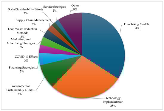 Within the finance field, key research themes were identified (Figure 12). Franchising models (34%) emerged as a major theme, analyzing restaurant performance metrics such as productivity, profitability, and efficiency through cost analysis, pricing, and forecasting. Technology implementation (28%) was another significant area. Studies included how restaurants save costs and boost sales via off-premises channels and social media. Environmental sustainability efforts (9%), food waste reduction methods (3%), and social sustainability efforts (2%) were notable themes related to ecological concerns. Studies in this area explored how sustainability practices such as energy consumption management and green supply chains affect restaurant performance. Other major themes included franchising strategies (5%) and marketing and advertising strategies (3%). These studies explored the impact of a series of strategies on restaurant performance. Other topics of significant interest were COVID-19 effects (3%) and supply chain management (2%). These topics reflected the desire to understand chain restaurants’ capital resilience during economic downturns. The “other” category (9%) encompassed diverse niche or emerging research areas that have not been extensively studied, such as cost management, operations and capital budgeting, internal auditing and pricing strategies.