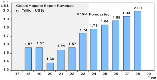 Figure 1 displays the time trend and growth of the global apparel sales revenue from 2018 to 2024 and the forecasted value to 2028. With the rising world population and world income, the demand for apparel is expected to grow further with time. The figure also shows the industry by major segments such as children’s apparel, men’s apparel, and women’s apparel. It is evident from this figure that women’s apparel dominates in the export market followed by men’s apparel and, next, by children’s apparel. The overall growth of the global apparel market will be beneficial for the apparel-exporting countries in the world including Bangladesh, the second-largest garment exporter in the world (