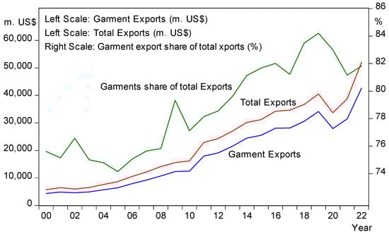 This study focused on two critical aspects of the export garment industry in Bangladesh: firstly, the growth and development of the industry over time and, secondly, to discuss some selected social compliance and social sustainability issues facing the industry. For the first issue, this paper used more elaborate, longer, and more up-to-date data to analyze the growth and development of industry including the sensitivity of total exports of the country to changes in garment exports, both variables measured in real (inflation-adjusted) terms. The study found continued strong trend growth over the years, and this growth was very resilient to changes in global economic crises and the COVID-19 pandemic. The study also found that garment exports contribute more than 80% of total exports and employ millions of workers, the majority of whom are female workers, and about 12% of the country’s GDP. In addition, the study found, based on the regression analysis, that the country’s total real exports were sensitive to real garment exports, but the elasticity was found to be less than unity. The implication is that both total exports and garment exports move together, and both seem to be generally stable over time, with some risk of instability in cases of serious disruptions, such as the 2019 pandemic (see