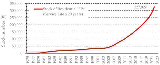 Development of the stock of HPs for residential heating (service life = 20 years) by 2022 in Austria (source: own illustration, data from Biermayr et al., 2023).