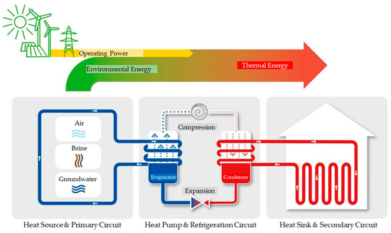 HP systems consist of three subsystems, i.e., the heat source (primary circuit), the HP with the refrigeration circuit, and the heat sink for space heating distribution and, frequently, the hot water supply (secondary circuit) (Figure 2).