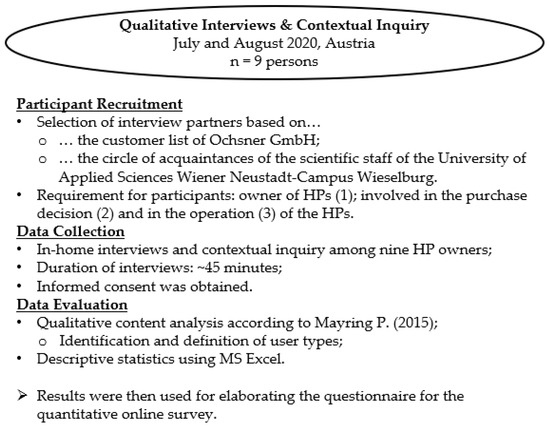 The qualitative interviews were conducted in July and August 2020 as in-home interviews with nine HP owners at their homes. Each interview lasted 45 min on average. A guideline with open questions was used to conduct the interviews. In addition, photos were taken of the HP and the use of the HP. A checklist of possible usable functions was used to record the functions already used and those already known or unknown when operating the HP. The selection of the interview partners was based on the customer list of Ochsner GmbH (=project partner), as well as from the circle of acquaintances of the scientific staff of the University of Applied Sciences Wiener Neustadt—Campus Wieselburg. All participants owned an HP, were involved in the decision-making process for the choice of HP, and usually also operated the HP.