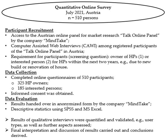 Based on the results of the qualitative interviews, a questionnaire was developed in collaboration with Ochsner GmbH to validate and quantify the results of the qualitative interviews. The target group for the quantitative survey comprised both HP owners and interested persons in Austria who are planning to purchase an HP in the next two years as part of a new build or renovation project. Membership of the target group was determined at the beginning of the survey by means of a screening question.