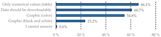 The entire questionnaire of possible response options can be found in the Supplementary Materials (Supplementary Materials: S2 Quantitative survey—online questionnaire). The questionnaire was implemented by the company “MindTake” as a CAWI (=Computer Assisted Web Interviews) questionnaire, and the target group was surveyed online via the sister company “Talk Online Panel”. The period of the online survey was July 2021. The evaluation and analysis of the quantitative survey results were carried out using descriptive statistics in SPSS version 28 and MS EXCEL 2019 (Figure 5).