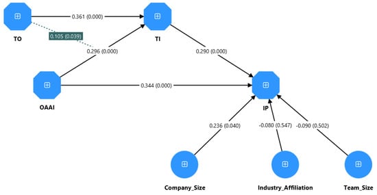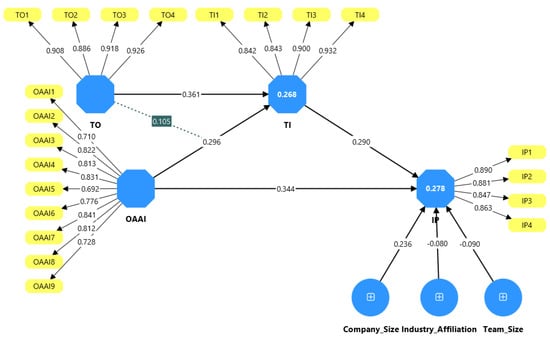 Measurement model displaying item loadings for AI orientation, team innovativeness, technology orientation, and innovation performance. TO: Technology Orientation; OAAI: Orientation to Adopt AI; TI: Team Innovativeness; IP: Innovation Performance.