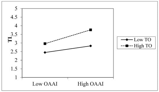 Moderating effect of Technology Orientation (TO) on the relationship between Orientation to Adopt AI Models (OAAI) and Team Innovativeness (TI), showing how higher TO strengthens the positive relationship between OAAI and TI within MNCs, thereby supporting the moderated mediation hypothesis of the study.