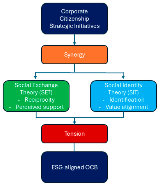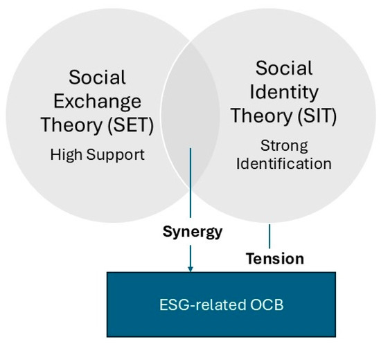 Although SET and SIT are frequently presented as complementary, their relative influence on employee behavior is highly context-dependent. SET-driven mechanisms, such as reciprocal behavior arising from perceived organizational support, tend to dominate in contexts where tangible organizational investments (e.g., recognition, incentives, and developmental resources) are visible and consistent. In contrast, SIT-based motives are more salient in environments where employees strongly identify with the organization’s values and sustainability mission, such as in purpose-driven firms or among long-tenured personnel. The dual-engine model advanced in this paper posits that SET and SIT may interact synergistically when high identification coexists with high organizational support, leading to elevated levels of ESG-aligned OCB. However, under certain boundary conditions, these mechanisms may also diverge. For example, when employees identify with a firm’s mission but perceive weak organizational support, the resulting dissonance may reduce motivation and engagement. In such cases, emotional drivers such as empathy, passion, or moral conviction may also act as intervening variables that moderate the translation of values into action (Yin et al., 2021). Recognizing this potential tension enhances the explanatory precision of employee engagement models in ESG contexts and addresses recent calls to integrate uncertainty, motivation, and institutional alignment in green performance research (Han et al., 2025; Islam et al., 2025). This interaction is visually represented in Figure 1, which illustrates the synergistic and competing forces of SET and SIT in shaping employee behavior related to ESG.