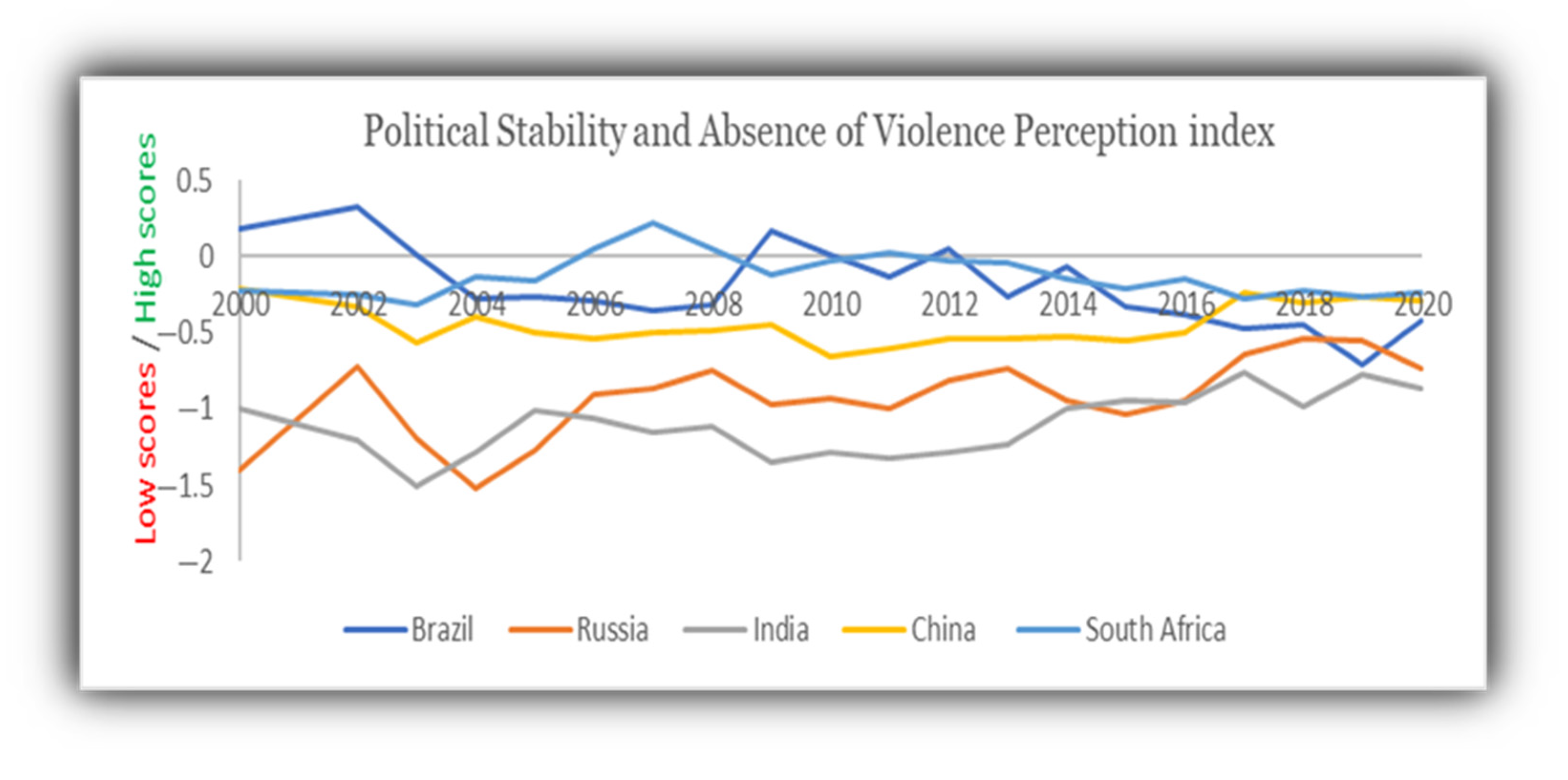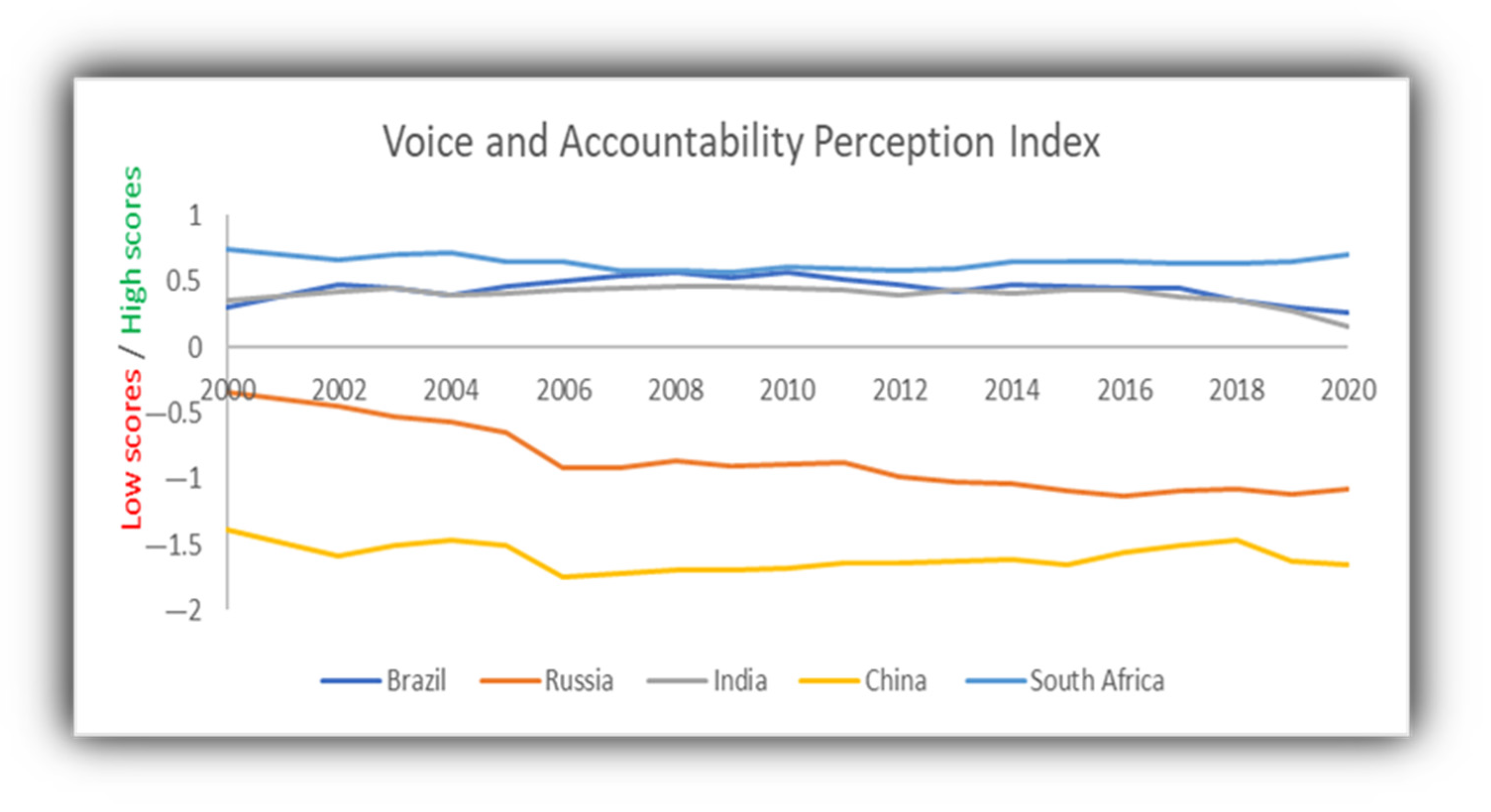 Figure 3, from 2000 to 2020. The voice and accountability perception index plot on the graph shows that Brazil, India and South Africa maintain stronger high scores. Brazil, India and South Africa consistently exhibit stronger scores, indicating a relatively higher level of voice and accountability perception in the firm’s home market throughout the observed period. This suggests that individuals and groups in these countries perceive a greater ability to choose their government, freedom of expression, association and access to a free press.