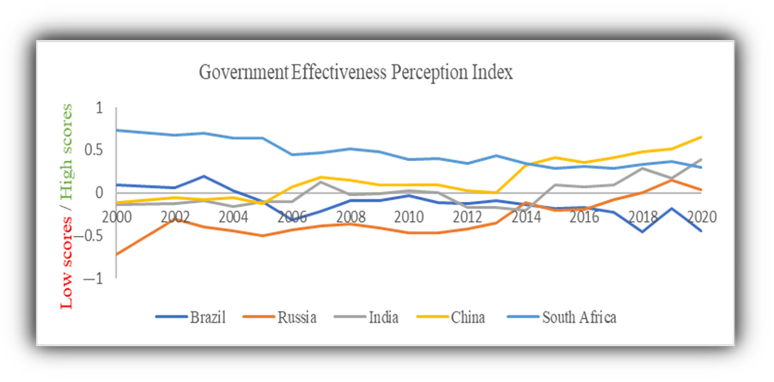 2022) study shows that government effectiveness in BRICS nations enhances trade openness and economic growth. Moreover, the governance quality in emerging market countries, where BRICS firms often represent a substantial portion, has posed challenges to financial market development (