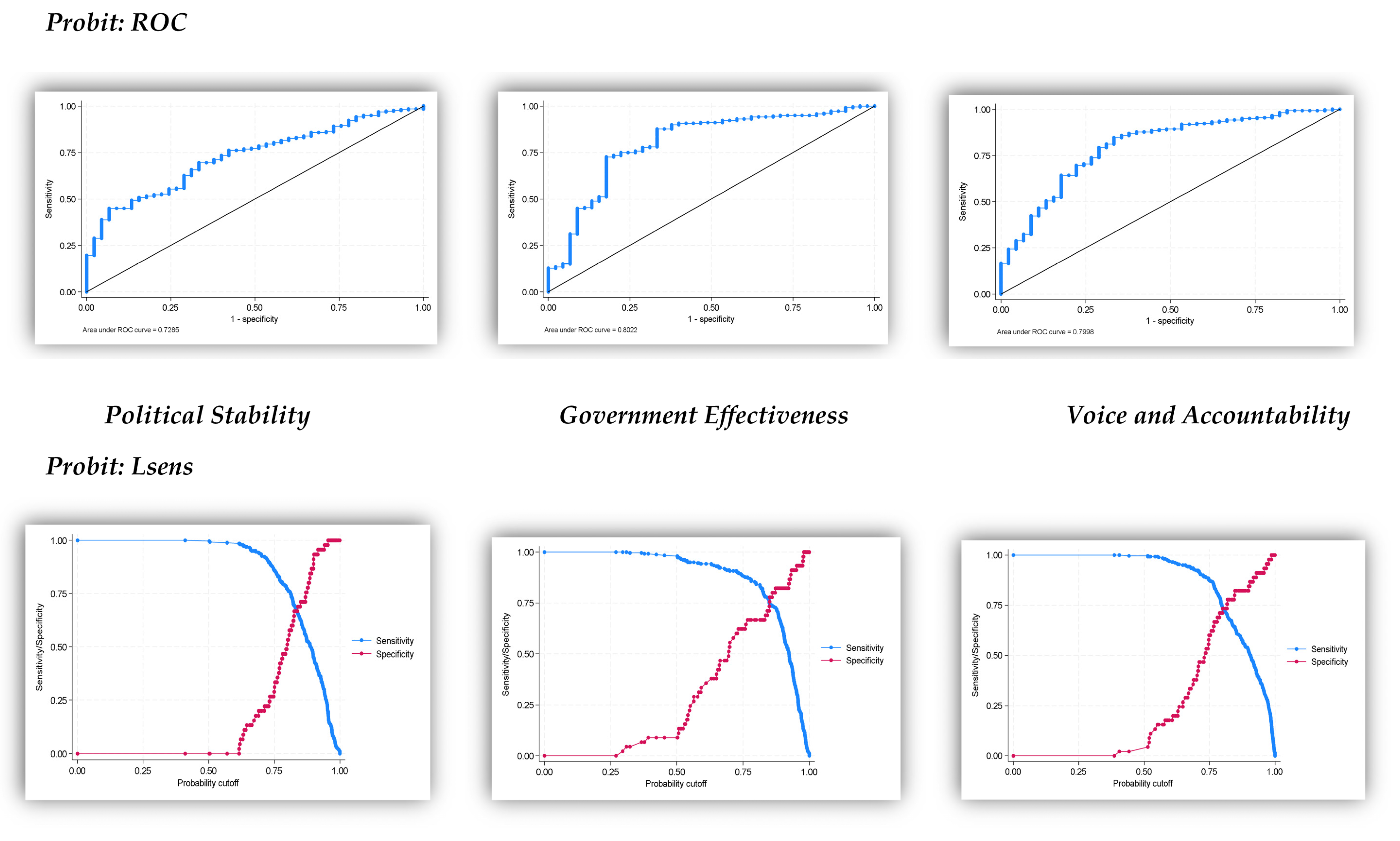 The probit estimations with Log Likelihood (LL) values across the models range from −121.05 to −102.25. Log Likelihood is a measure of model fit; higher (less negative) values indicate better model performance. This suggests that political stability, government effectiveness and voice and accountability variables in the better-performing model explain the cross-listing location adoption more effectively. The likelihood sensitivity (Lsens) in