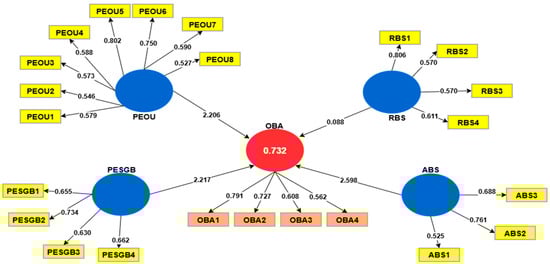 The strongest observed correlation is between PESGB and OBA (r = 0.678). This highlights the crucial role that perceptions of a bank’s ESG performance play in encouraging the adoption of digital banking services. In today’s sustainability-driven landscape, customers may be more likely to engage with banks that demonstrate strong environmental, social, and governance values. Similarly, the second strongest relationship is between PEOU and ABS (r = 0.599), which suggests that when online banking systems are perceived as easy to use, users also tend to find them more accessible. These two dimensions appear to reinforce each other, emphasizing the importance of user-centered design.